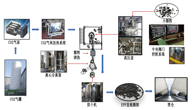 Epp材料生產(chǎn)所使用到的設(shè)備包括二氧化碳?xì)獗煤蜌夤蕖怏w加熱系統(tǒng)、高壓釜、離心分離器、中央控制系統(tǒng)、烘干機(jī)、筒倉(cāng)等。大致的作用可看上圖。